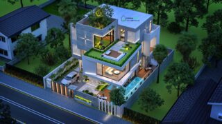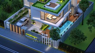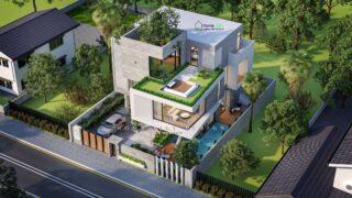 + Tầng 1: Gara Oto + Sân vườn + Bể bơi + Phòng khách + Sảnh thang + Phòng bếp nấu + Bếp ướt + Phòng ăn