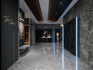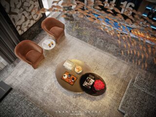 Không gian mở với trần cao, sử dụng tone màu trầm trung tính, nội thất bọc vải cao cấp, đèn trần nghệ thuật lấy cảm hứng từ chuyển động đàn cá. Các mảng đá tự nhiên và tranh tường trừu tượng tạo chiều sâu và sự độc bản cho mỗi góc nhìn.