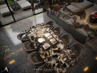 Bàn ăn nổi bật với mặt đá quý tự nhiên, mang vẻ đẹp vừa mộc vừa sang, kết hợp ánh sáng rọi điểm và ghế uốn cong mềm mại – tạo nên trải nghiệm dùng bữa đẳng cấp như tại khách sạn 5 sao.