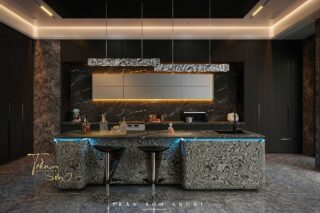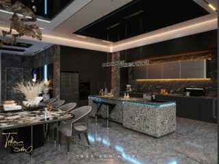 Bếp hiện đại với hệ tủ âm – mặt đá vân mây – đèn LED hắt sang trọng. Đảo bếp kết hợp bar mini phong cách châu Âu, là nơi vừa chế biến vừa kết nối cảm xúc. Hệ tủ trưng bày rượu tinh tế cho thấy gu thưởng thức đầy tinh tế của gia chủ.